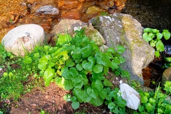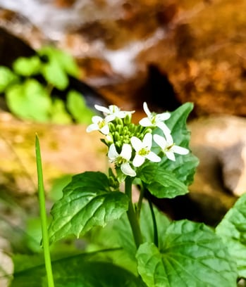 小川では葉ワサビの可憐な花を見つけました。自然の営みに心を癒されます。(21.04.03)